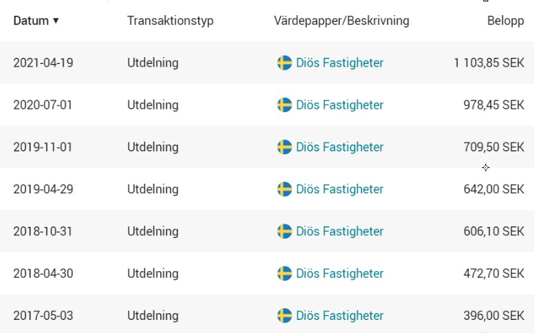 Såhär har utdelningen utvecklats genom åren. Då väntar jag fortfarande på den andra utdelningen 2021 nu när Diös delat upp utdelningen i 2 tillfällen per år.