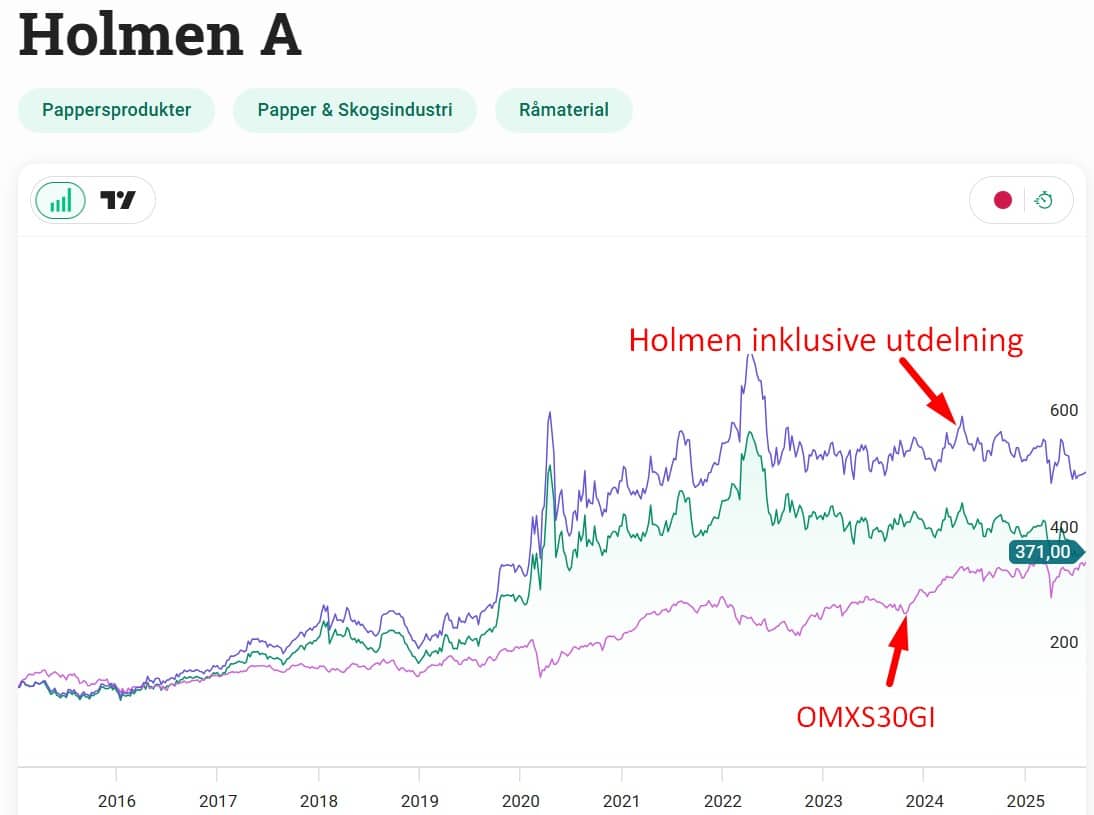 Holmen är det mest intressanta jag hittat. Trots att de sista åren varit förlorade år så har ändå aktien de sista 10 åren slagit OMSX30GI om vi även inkluderar återinvesterad utdelning. Med hyfsat mycket dessutom.