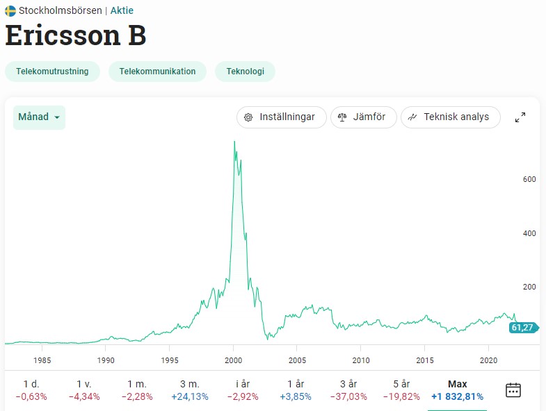 Om du kikar på Ericssons kursgraf så ser den verkligen inte positiv ut. En explosion under IT-bubblan som givetvis inte höll särskilt länge. Sedan dess ser det rätt ruttet ut