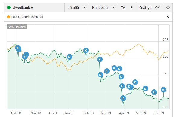 Den vanligaste frågan jag får är om jag köper Swedbank samt varför aktien fortsätter ner. Allt jag kan säga är att jag fortsätter handla Swedbank i omgångar samt att aktien går ner p.g.a. oro. Börsen är framåtblickande, och finns det problem för ett bolag som kan påverka dem negativt så kommer aktien utvecklas negativt, allt annat lika.
