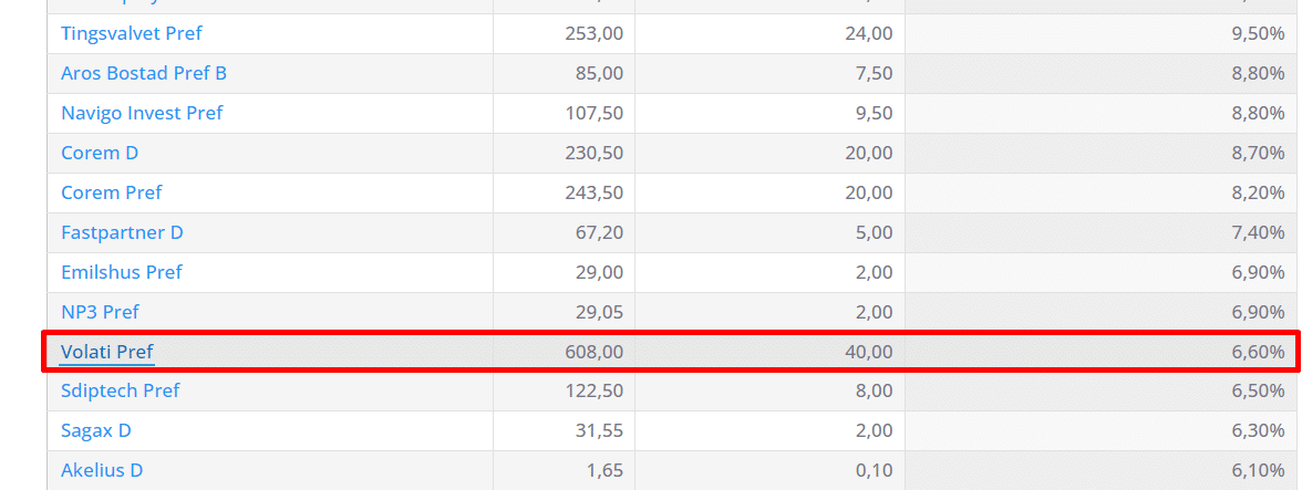 Tyvärr innebär detta att Volatis preferensaktie handlas till en relativt låg direktavkastning på 6,6%. Enbart tre andra handlas till lägre. Det vittnar också på Volatis styrka och att ingen ko ännu är på isen.