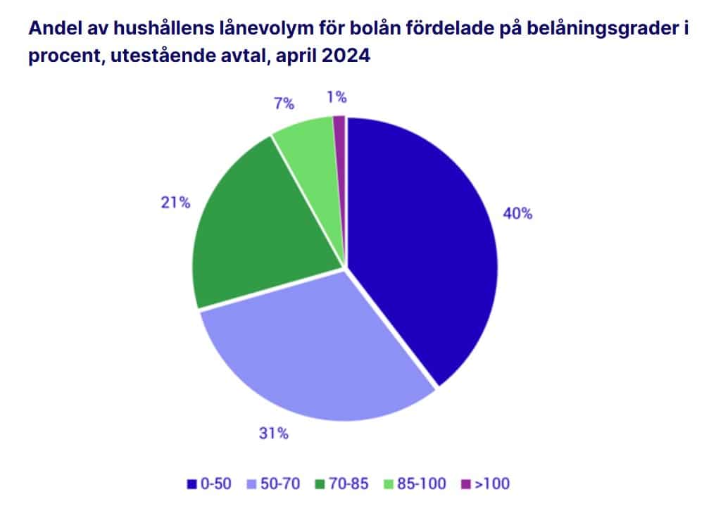 Majoriteten har idag en belåningsgrad på 0-50%. Det är också en stor del som har 50-70% men en av fem svenskar ligger också på 70-85%. Rätt spritt med andra ord.