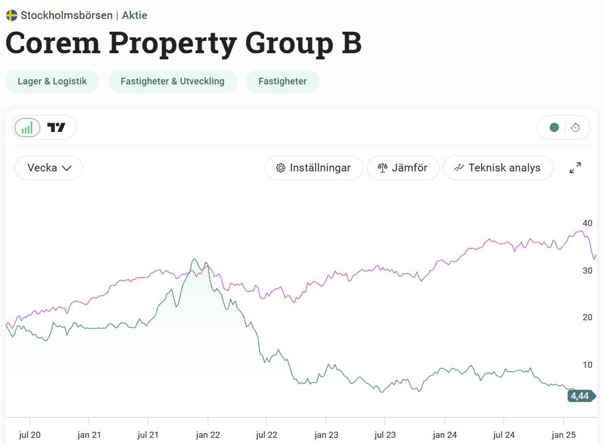 Inklusive återinvesterad utdelning är Corem B ner hela 75% sedan pandemin. Fastighetsindex i stort ligger och nosar på nollan under samma period, klart sämre än Stockholmsbörsen i helhet. Det här har även varit kännbart för mig som har en hyfsad stek fastighetsbolag i portföljen.