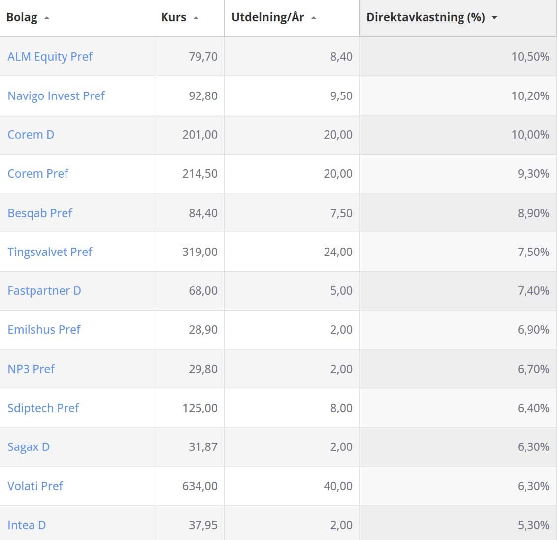 Jag har länge haft en lista över våra preferens- och D-aktier på Stockholmsbörsen. Som du känner till får du i dessa inte ta del av bolagets ökade vinster i form av utdelningshöjningar då utdelningen sedan tidigare är spikad.