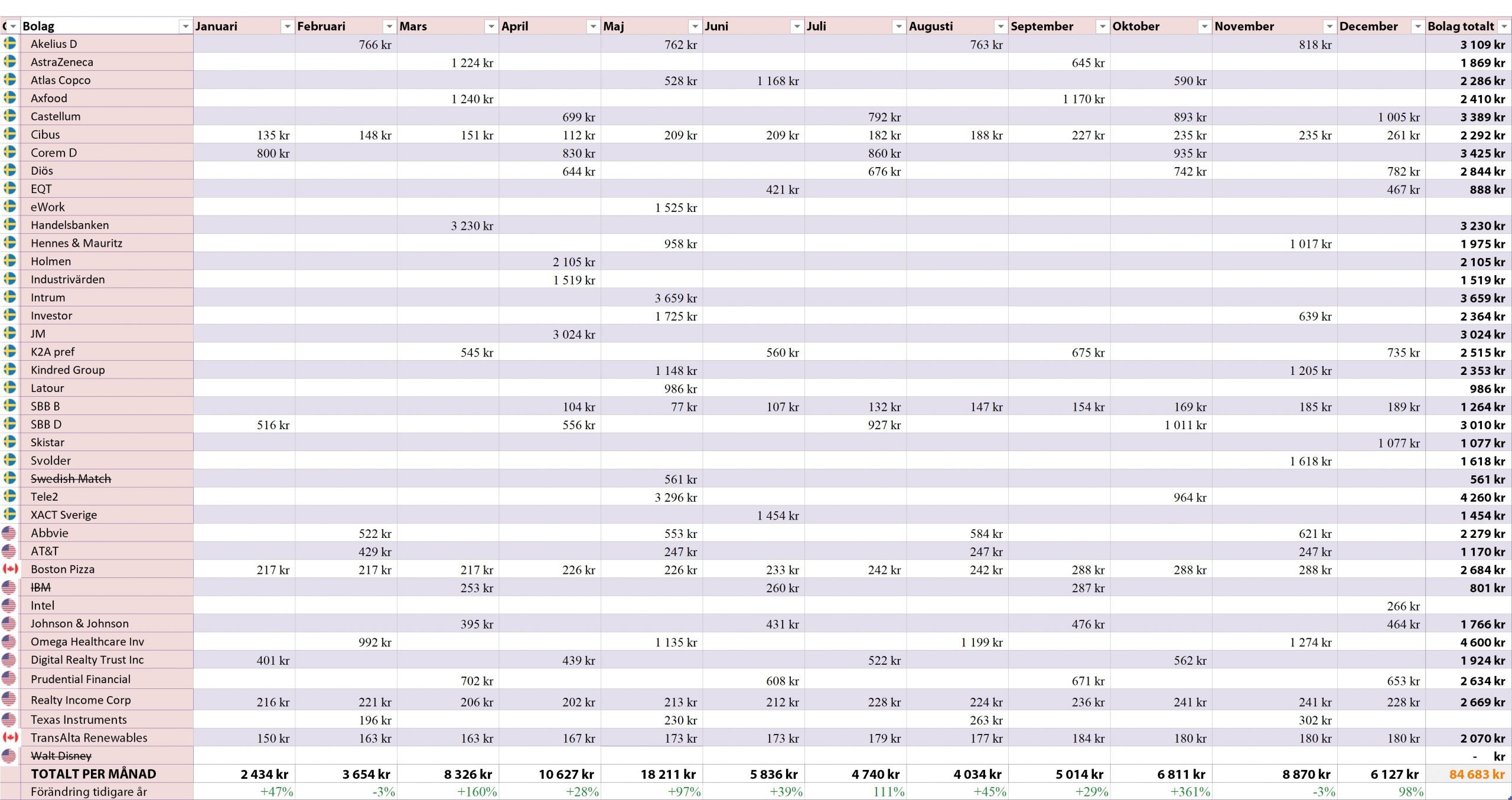 Tabellen här nere visar hur mycket respektive bolag delat ut 2022. Längst nere till höger visar jag den totala summan av alla utdelningar som trillat in under året.