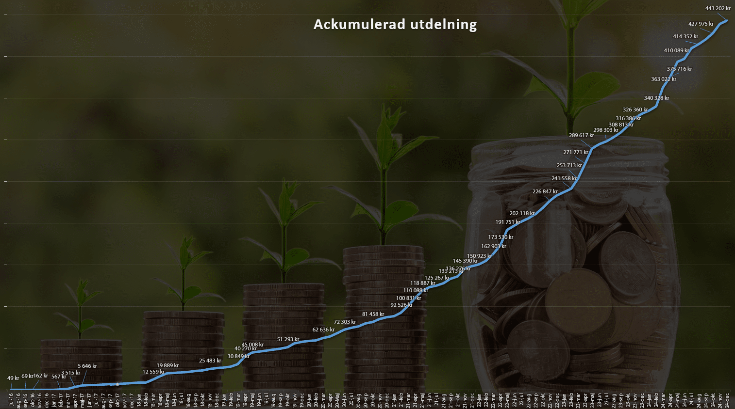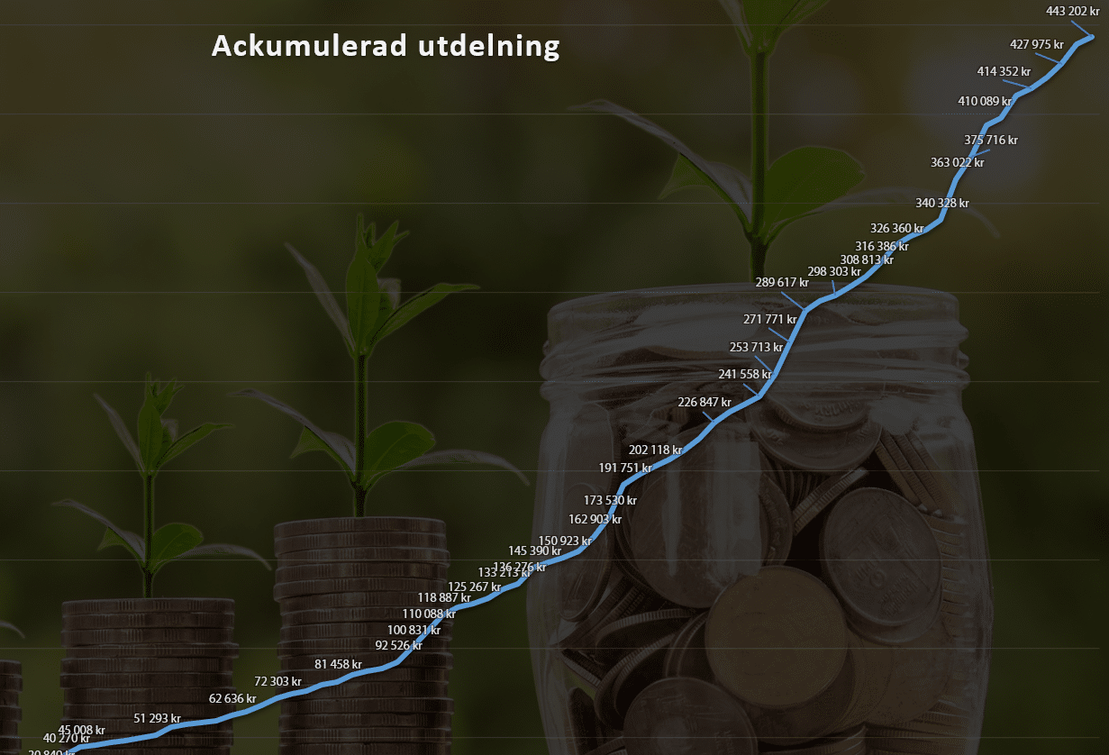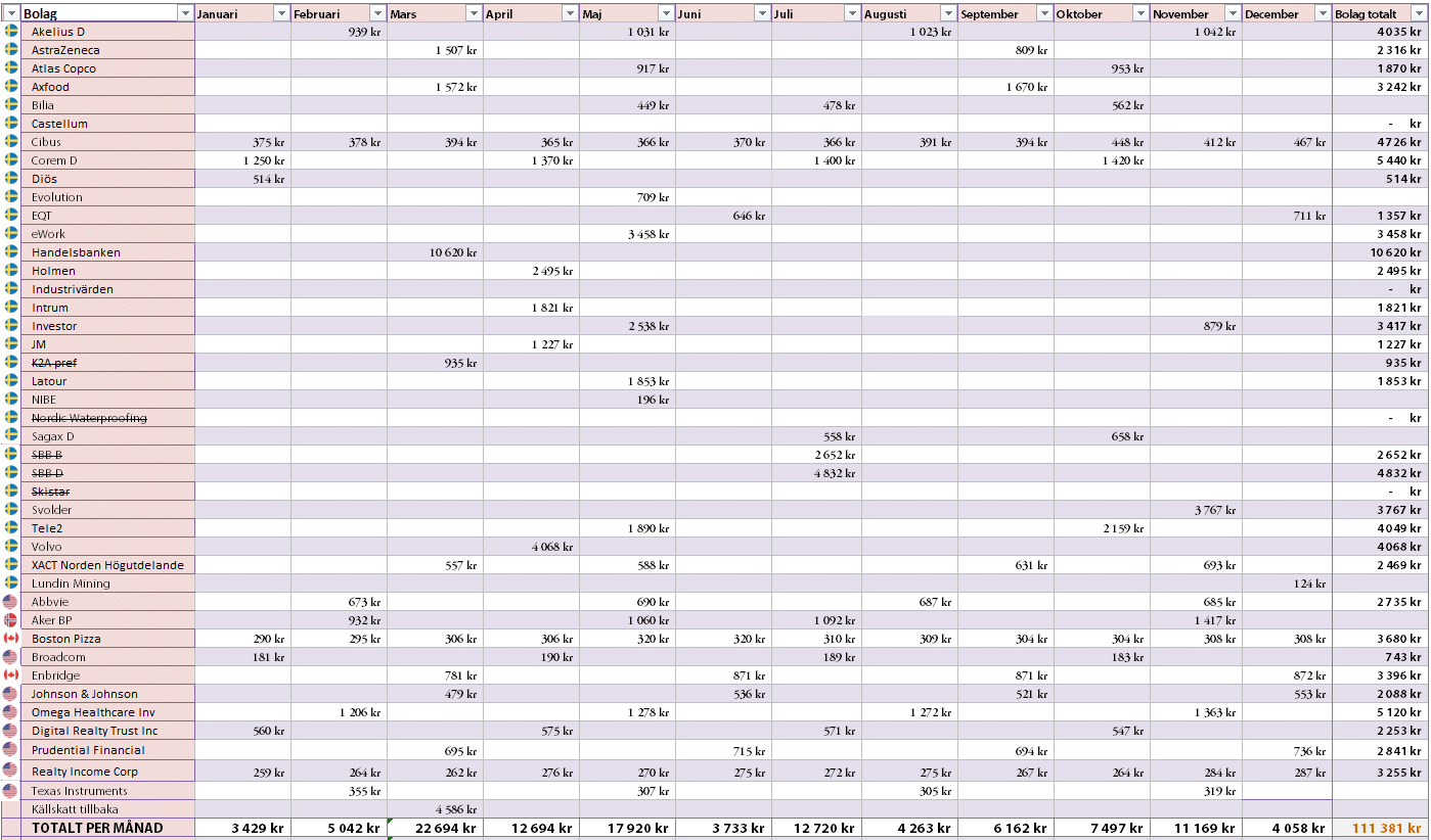 Här nedan har jag lagt till en tabell som visar hur mycket varje bolag har delat ut månad för månad. Till höger finns det även en summering som visar totalen för respektive bolag under året. Vill du använda den här mallen gratis så kan du ladda ner den här.