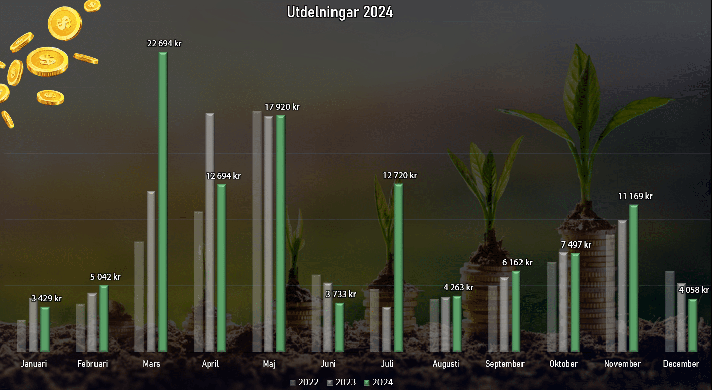 Bolag | Antal | Utelning 2023 | Utdelning 2024 | Extra 2024 | Utdelningstillväxt | Total. |