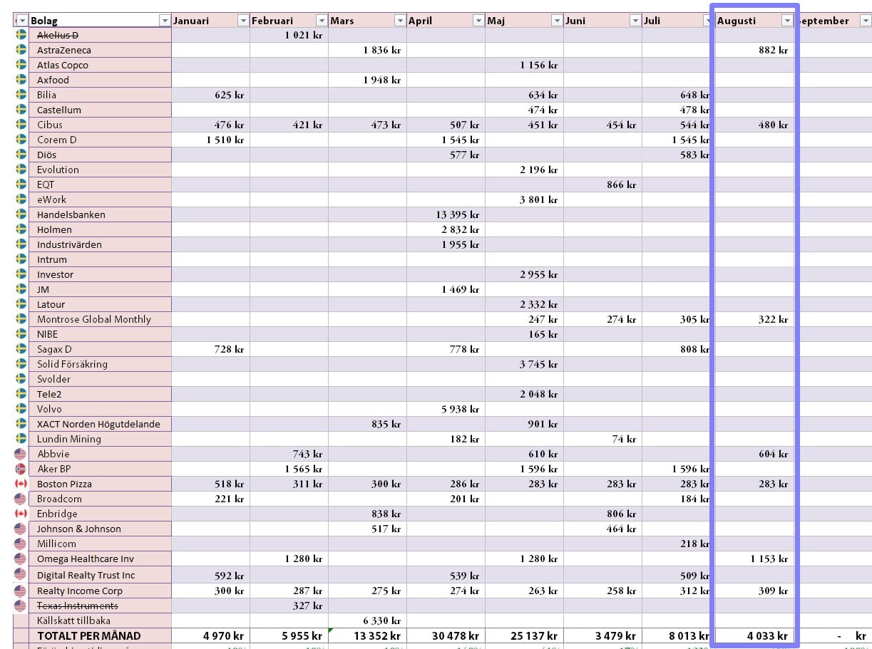 Att kalla augusti för en utdelningsfrekvent månad är en lögn, i alla fall som min egna portfölj är utformad. Några tusenlappar blir det i alla fall och som vanligt gäller ”många bäckar små” när det kommer till hur investeringar växer över tid. Sedan har jag funderat en del på att ta in ytterligare en månadsutdelare i portföljen.