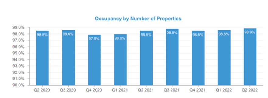 I sin rapport för kvartal 2 meddelade Realty Income att man ökar beläggningsgraden med 0.3 procentenheter från tidigare. Det här är alltså hur stor del av deras fastigheter som man lyckas hyra ut. Nu är den högre än någonsin om vi kikar från den tidpunkt då Covid-19 slog till. Hela 98.9%.