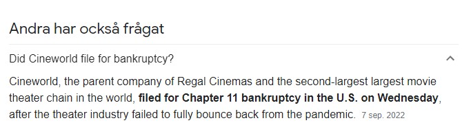 Nu när jag försöker hitta det så lyckas jag inte. Så tillslut hittade jag något om att CineWorld (biograf) flaggat för konkurs.