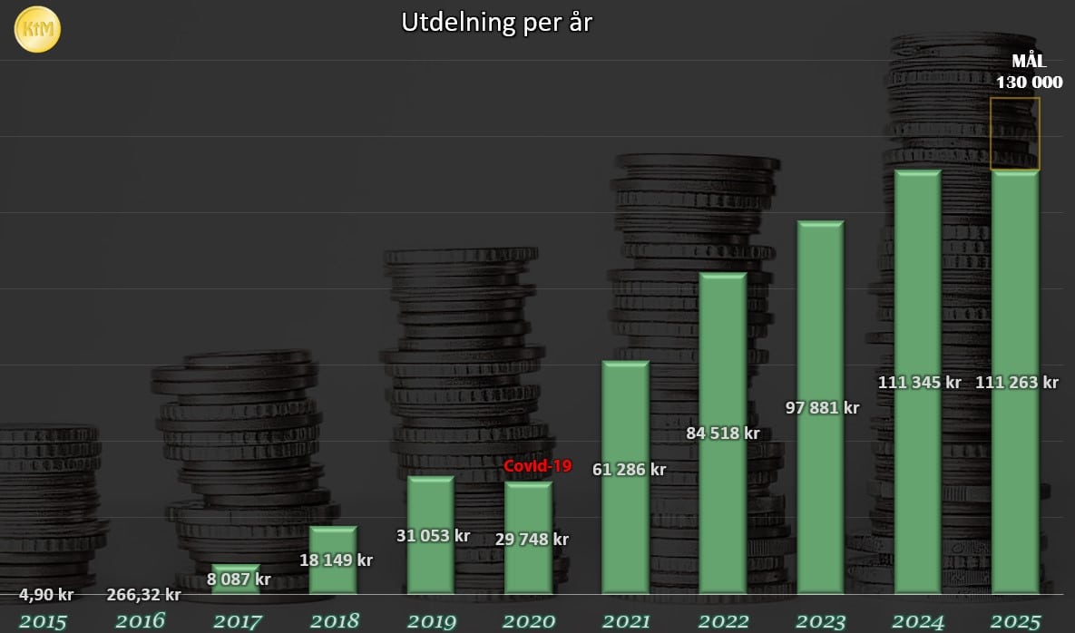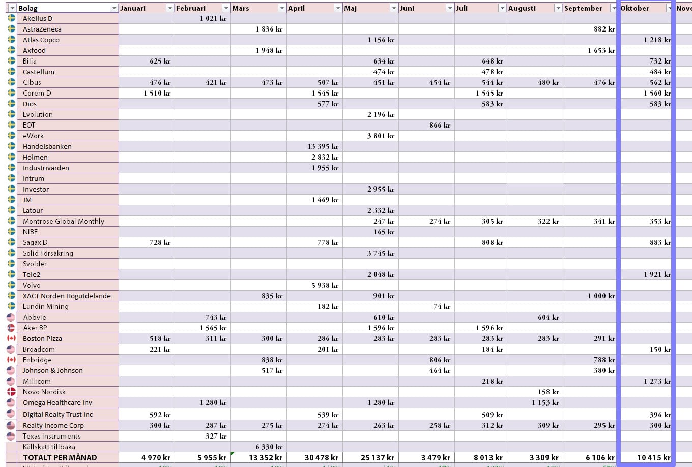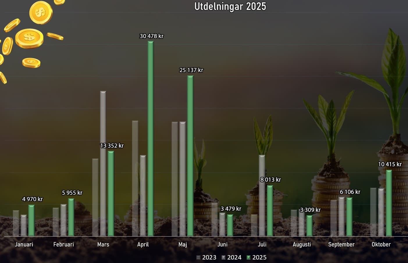 Oktobers siffror gör också att jag tangerar utdelningsrekordet förra året med två månader kvar av 2025. Allt som inkasseras i november och december blir alltså en bonus. November brukar även vara en av de bättre utdelningsmånaderna för mig.